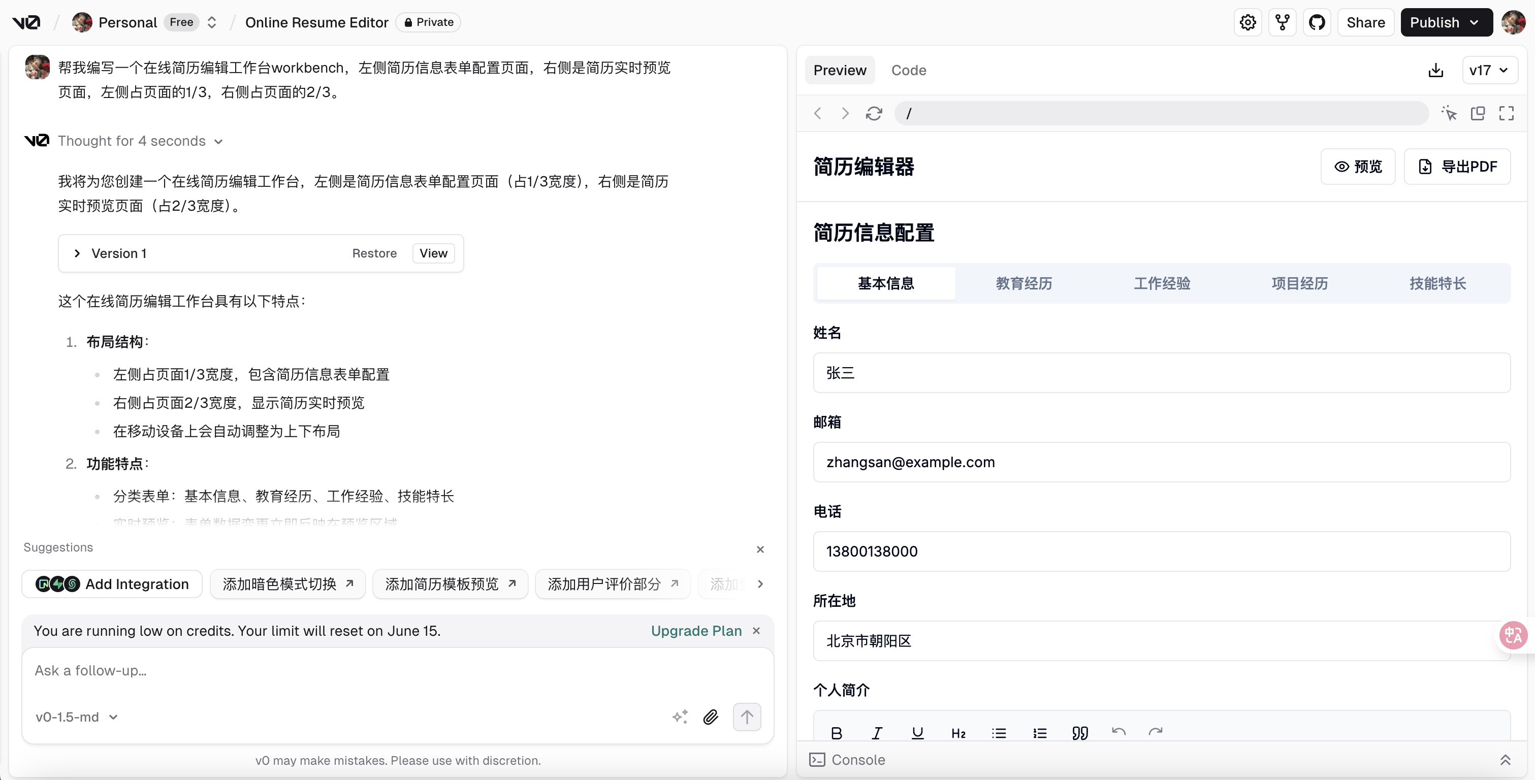 利用 v0.dev 生成的页面是 Nextjs + Shadcn UI 的页面。我们可以快速的启动项目并且 1:1 的复刻出来,然后利用 Cursor/Trae 的 AI 能力,快速实现页面功能。