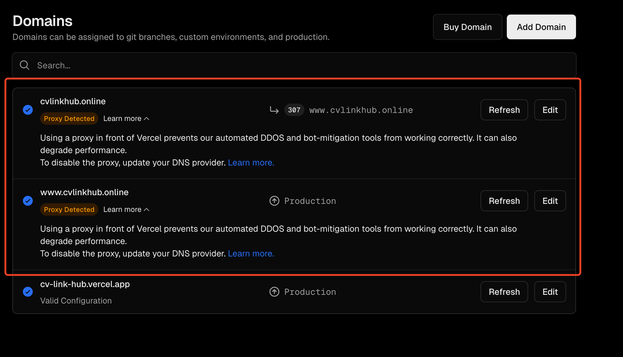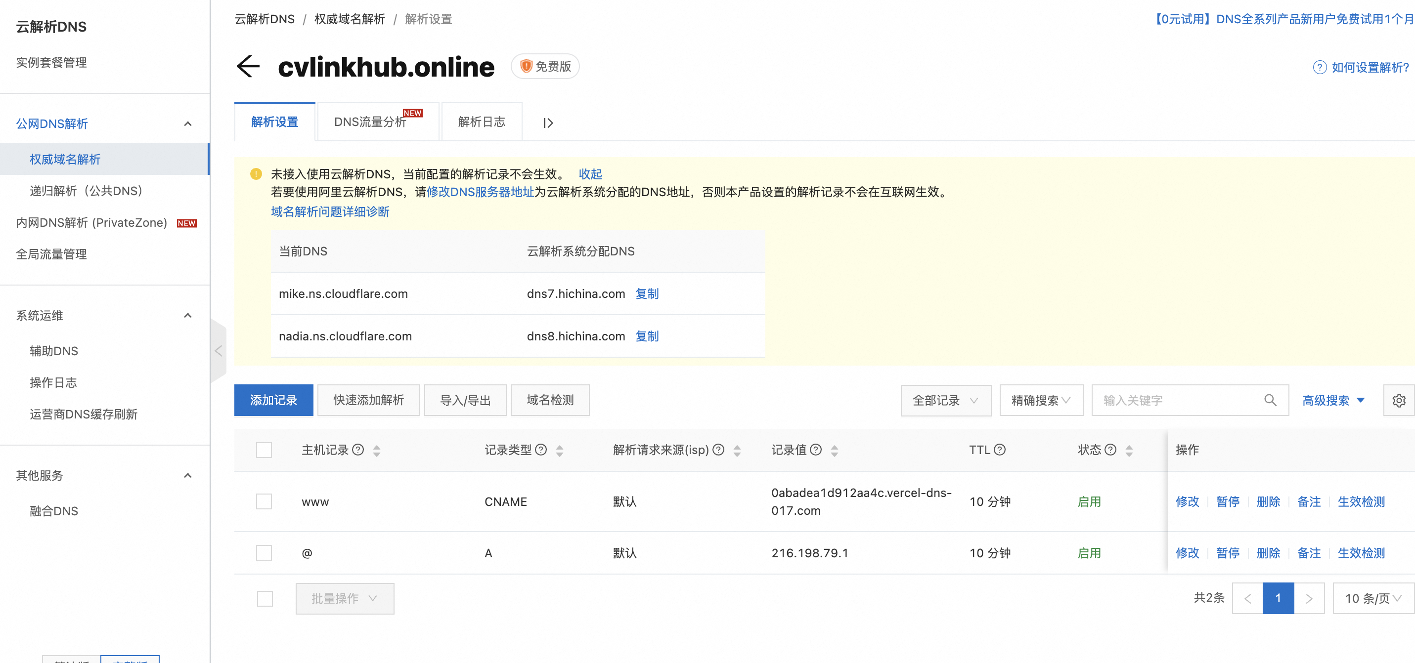 修改 DNS 服务器地址,然后添加域名解析记录,A 记录和 CNAME 记录都添加,A 记录是 Vercel 的 IP 地址,CNAME 记录是 Vercel 的域名。(按理在 Cloudflare 上添加过了,应该不需要再添加了)但是没生效,我添加了以后,过了一会,就生效了。